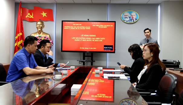 Sáng ngày 10/11/2021, tại Trụ sở làm việc, Trường Đào tạo, Bồi dưỡng cán bộ quản lý Thông tin và Truyền thông (Trường) phối hợp cùng với Cục Báo Chí (Cục) và Học viện Chính trị quốc gia Hồ Chí Minh tổ chức Lễ Khai giảng trực tuyến lớp “Bồi dưỡng nâng cao kiến thức quản lý nhà nước về báo chí” cho học viên là lãnh đạo hoặc đang trong diện quy hoạch lãnh đạo của Học viện Chính trị quốc gia Hồ Chí Minh.