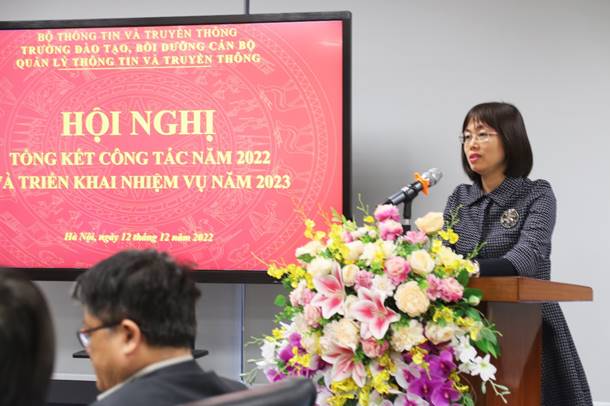 Phát biểu ghi nhận những kết quả mà Trường đã đã đạt được trong năm 2022, Thứ trưởng Bộ TT&TT Phan Tâm chúc mừng Trường đã hoàn thành vượt các chỉ tiêu đặt ra năm 2022 đồng thời mong Trường sẽ tiếp tục những thành quả này trong các năm tiếp theo. Về nhiệm vụ trong năm 2023, Thứ trưởng nhấn mạnh một số việc mà Trường cần tập trung thực hiện: