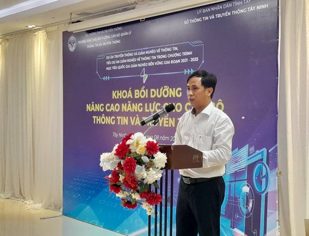 Phát biểu Khai giảng lớp học, ông Lê Ngọc Bảo, Phó Hiệu trưởng Trường Đào tạo, Bồi dưỡng cán bộ quản lý Thông tin và Truyền thông nêu rõ: Khoá “Bồi dưỡng nâng cao năng lực cho cán bộ thông tin và truyền thông” tại Tây Ninh trong khuôn khổ của Dự án Truyền thông và giảm nghèo về thông tin, thuộc Chương trình mục tiêu quốc gia giảm nghèo bền vững giai đoạn 2021-2025. Khoá học được tổ chức với mục tiêu: Cung cấp kiến thức, kỹ năng về công tác truyền thông về giảm nghèo thông tin cho các lực lượng làm công tác thông tin và truyền thôn cũng như truyền thông nâng cao nhận thức trách nhiệm của toàn xã hội, của người nghèo về công tác giảm nghèo về thông tin, bảo đảm an sinh xã hội bền vững. Đặc biệt khoá học sẽ có 1 ngày đi học tập thực tế tại Đài phát thanh và truyền hình Long An.