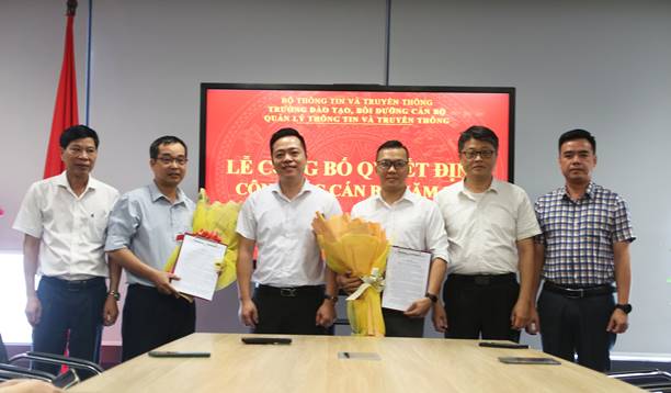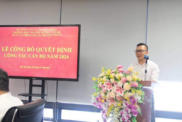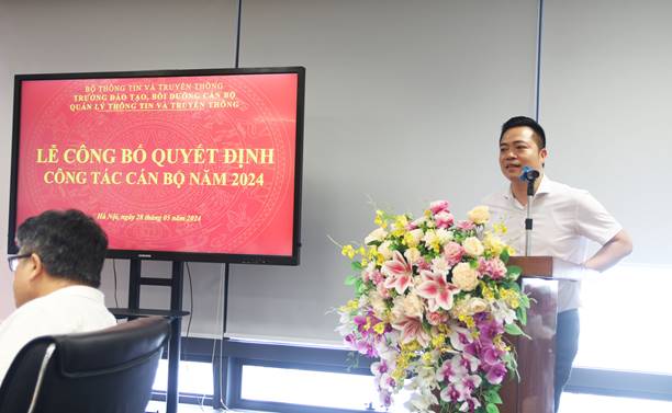 Sáng ngày  28/5/2024,  tại trụ sở làm việc, Trường Đào tạo, Bồi dưỡng cán bộ quản lý Thông tin và Truyền thông tổ chức Lễ công bố và trao quyết định của  Hiệu trưởng  Trường Đào tạo, Bồi dưỡng cán bộ quản lý Thông tin và Truyền thông về việc điều động, bổ nhiệm chức vụ Phó Trưởng phòng Tổ chức, Hành chính cho ông Lê Tiến Dũng và điều động và bổ nhiệm  chức vụ Phó Trưởng phòng Tư vấn và Phát triển Dịch vụ đào tạo cho ông Đoàn Hoàng Tùng.
