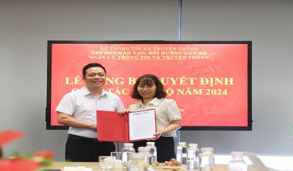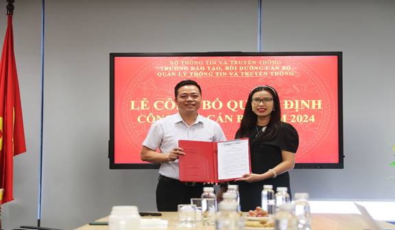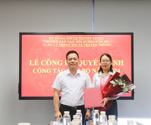 Hiệu trưởng Đinh Đức Thiện trao quyết định cho Đ/c Nguyễn Thị Thu Trang